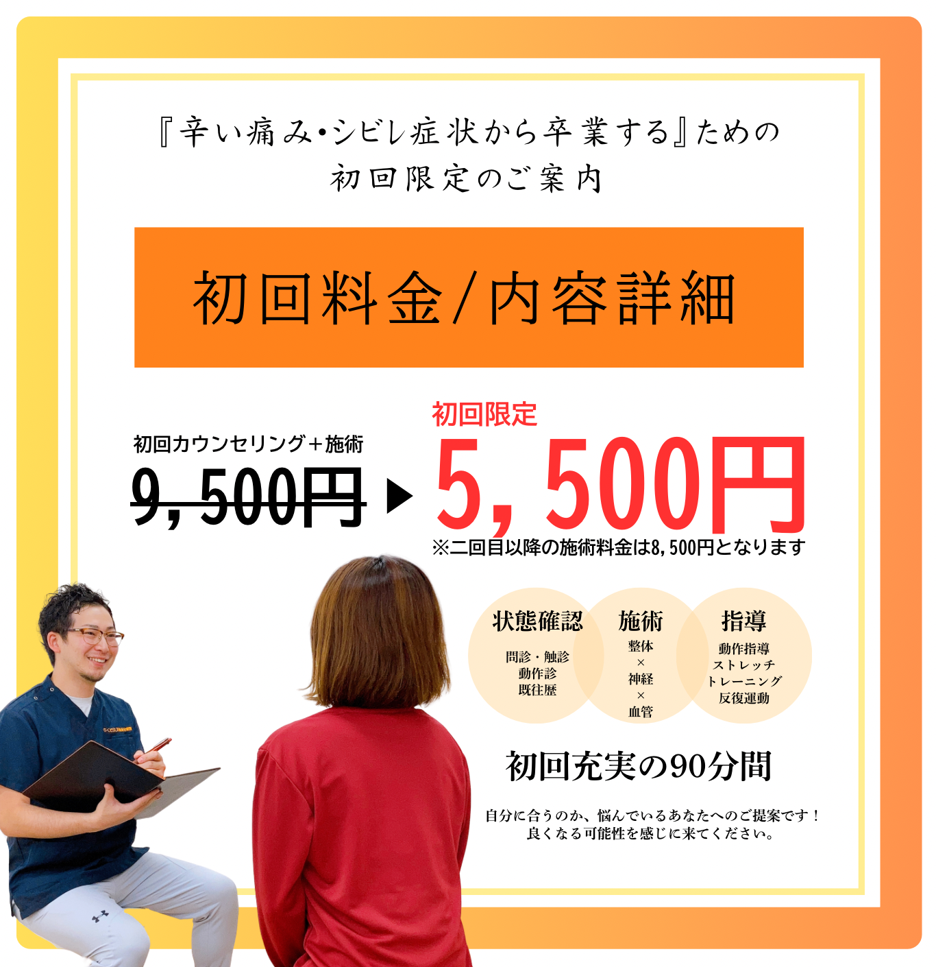 「他の整体でも改善されなかったから不安・・・・」そう思い整体選びを迷っている方に、ぜひ一度当院の施術を体験して改善される可能性を感じていただきたく、初回限定キャンペーンを実施しております。